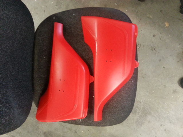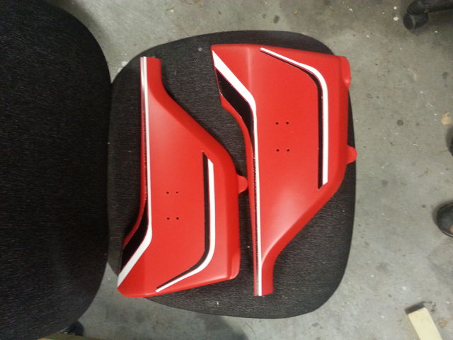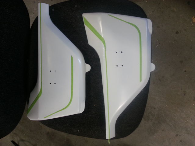 2015-02-04 Started to paint the side covers. They were black so masked the stripes I wanted to be black then sprayed the whole lot white. Then masked what stripes I wanted to be white and then sprayed the whole lot red. Hope it works. Problem with spray painting is waiting for the paint to dry.