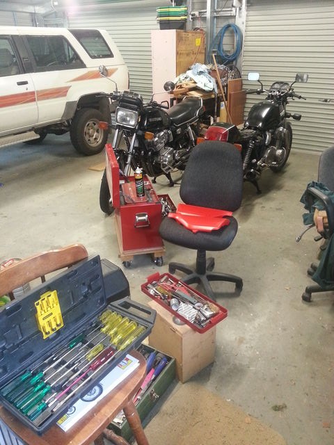 Below is the tools and bits of bike all over the shed.