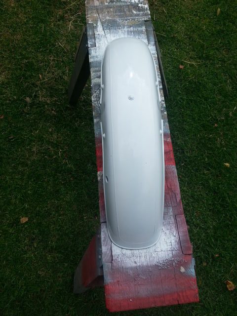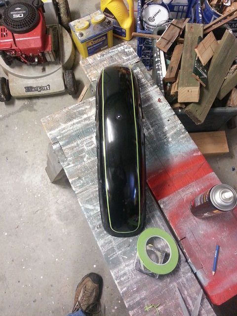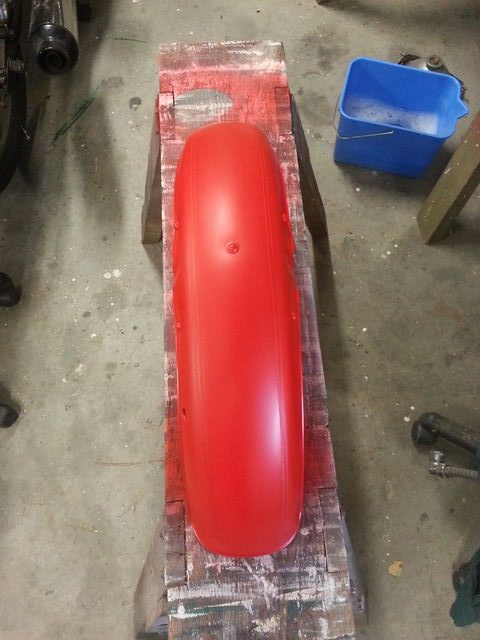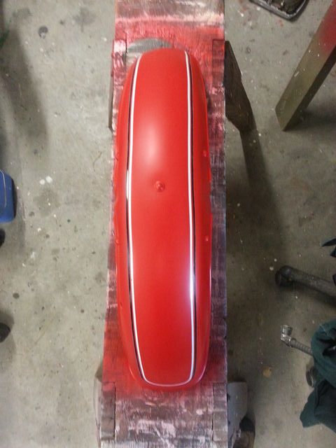 Below is the painting of the front guard. It was originally black and I masked the pin stripe and then sprayed it white then masked the white and painted the whole lot red.